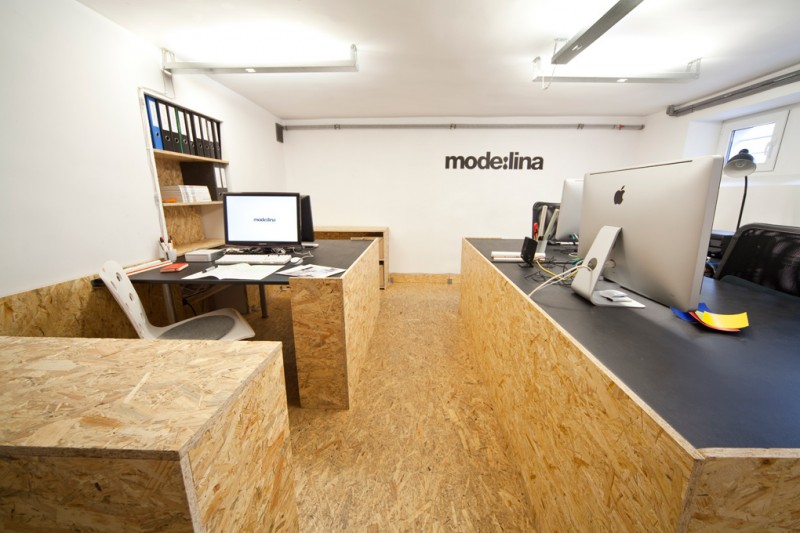 Les architectes de mode:lina n'y sont pas allés de main morte : sol, bureaux, étagères. L'OSB est partout dans leur agence.